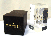 透明なプラスチックの中にZENITHの時計部品が埋め込まれています。